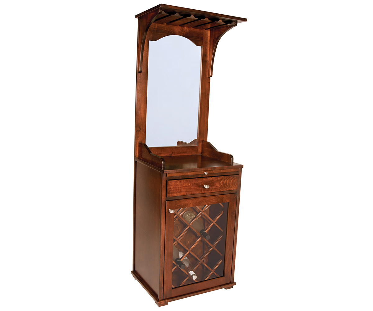 Features: • Hold 12 pieces of stemware in top • Mirrored back • Dovetailed drawer with full extension slides • Pull out serving tray • Twelve bottle storage area in the base