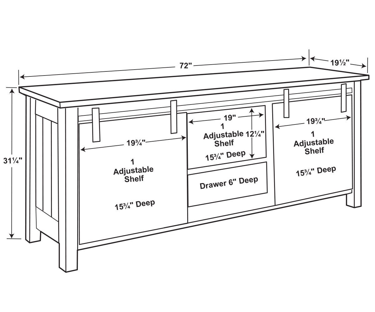 Features: • Soft close sliding doors • One adjustable shelf in each compartment • Dovetailed drawer in the center compartment