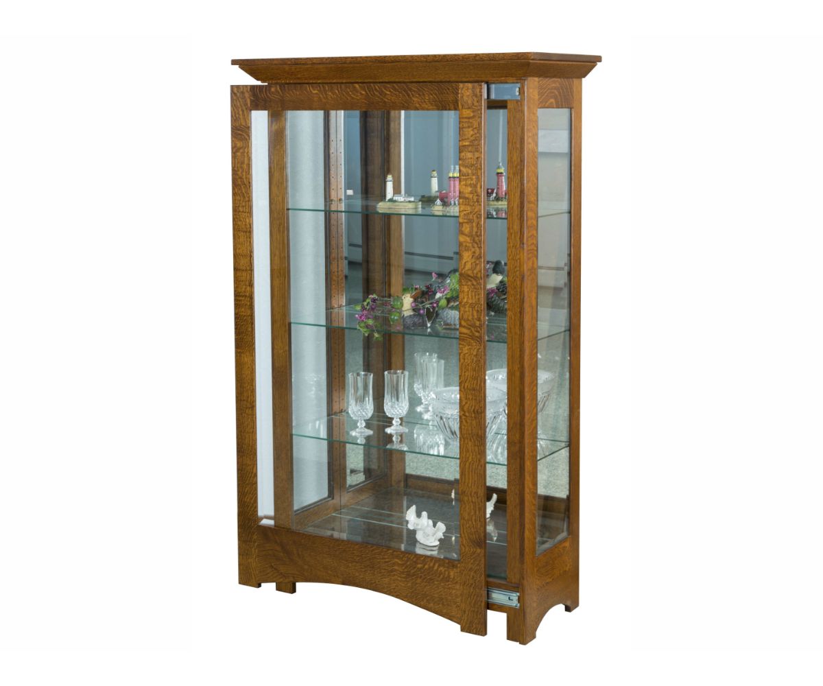 Features: • Sliding door on full extension slides • Mirror back • Beveled glass doors and sides • LED lighting • Three adjustable glass shelves