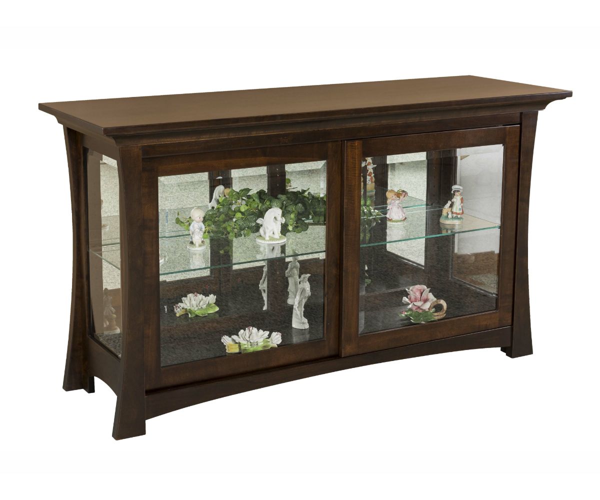 Features: • LED touch lighting • Two sliding bevel glass doors • Mirrored back • One adjustable glass shelf behind the doors