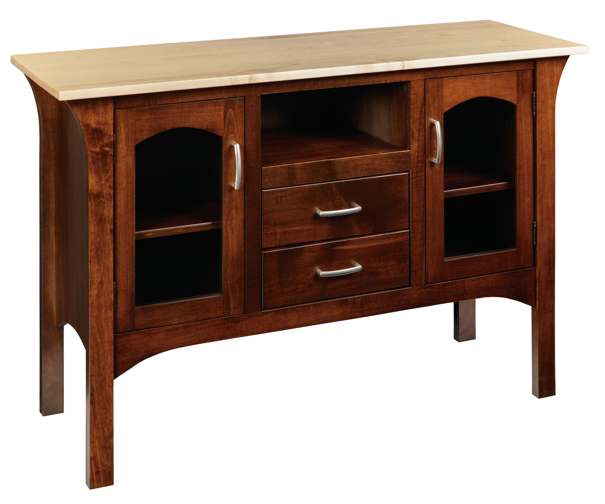 Features: • Pullout serving shelf in the center opening • Center opening: 15″W x 14¾”D x 6½”H • Dovetailed drawers • Full extension drawer glides • One adjustable wood shelf behind each door