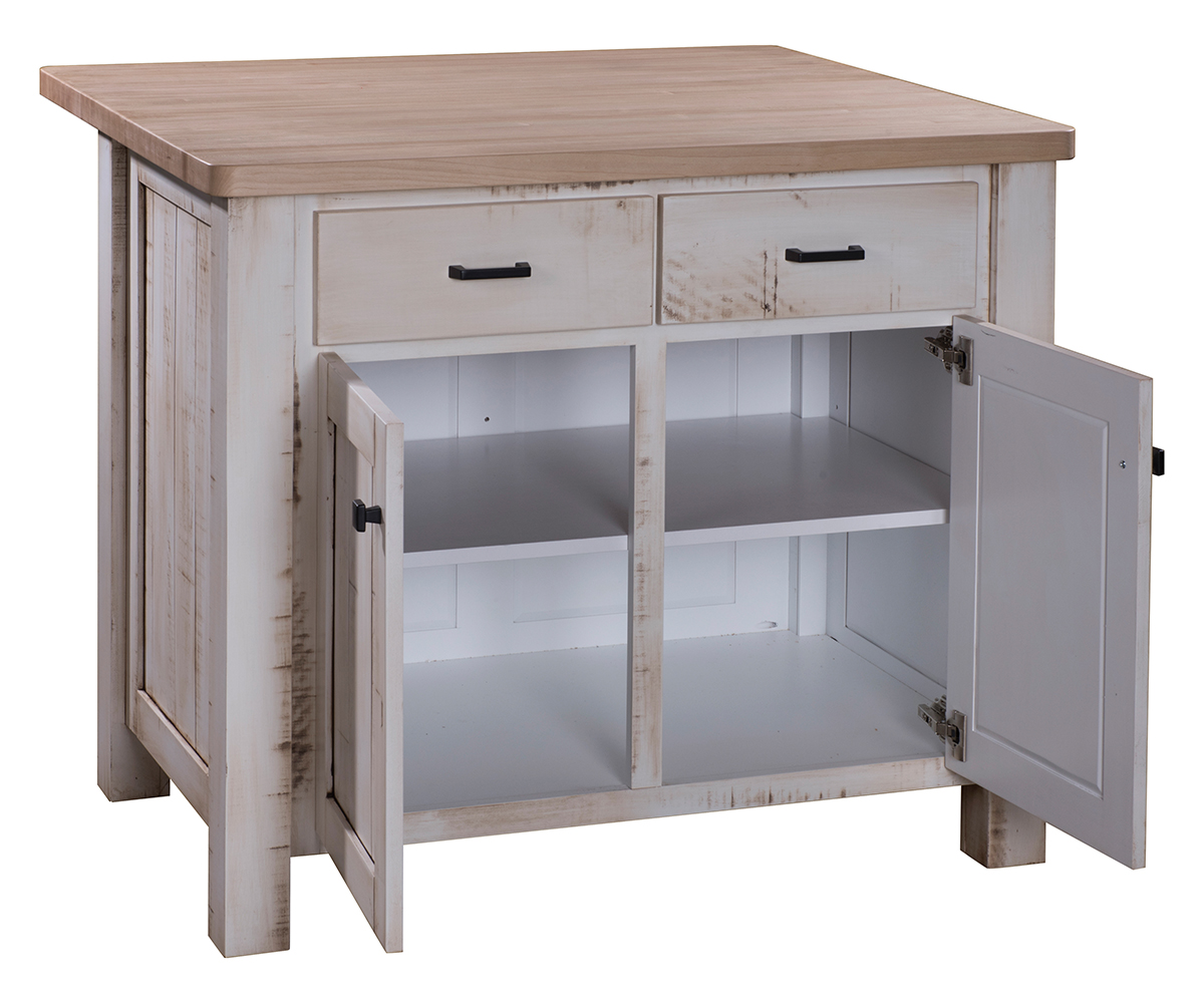 Shown With: Wood – Top: Hard Maple Butcher Block Wood – Base: Rough Sawn Barn Floor Finish – Top: Oiled Paint – Base: White With Warm Brown Glaze