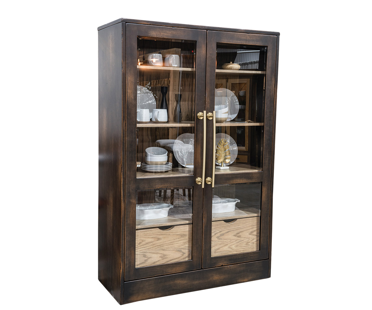 Features: • Beveled glass doors • Shiplap back • Three adjustable wood shelves • Two pull out drawers in the bottom